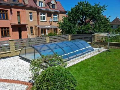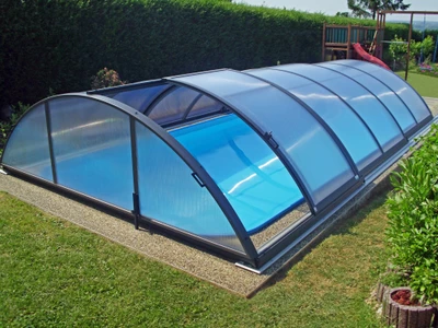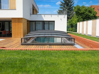 Ez az elegáns modell különösen lapos, függőleges oldalfalaival és finoman ívelt vonalaival tűnik ki. Ennek köszönhetően a fedés szinte belesimul a kert látképébe, anélkül hogy eltakarná a kilátást vagy elnyomná a környezet stílusát.