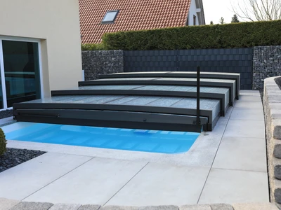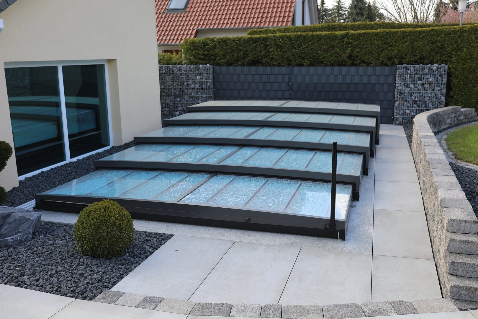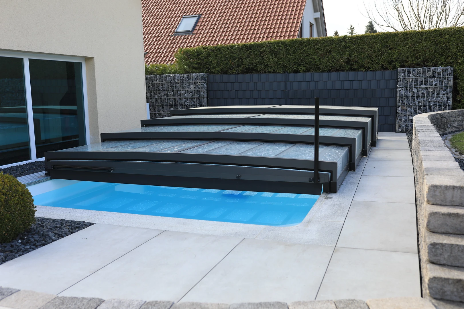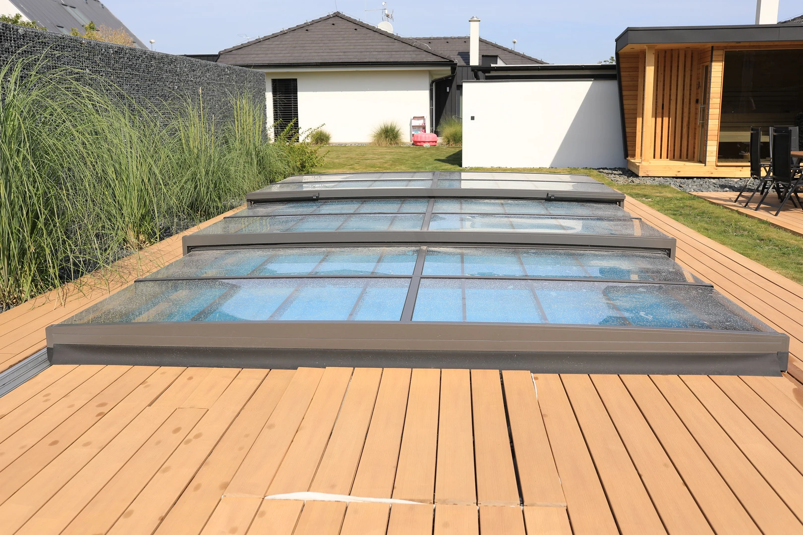 A PARADE LOW medencefedés diszkrét és hatékony megoldást kínál azok számára, akik a medencetér védelmét szeretnék stílusosan megoldani, anélkül hogy megtörnék kertjük természetes látványát. Ultraalacsony kialakítása lehetővé teszi, hogy harmonikusan illeszkedjen bármilyen környezetbe, miközben modern, letisztult formavilága eleganciát sugároz. A fedés íveiben az éles és lekerekített vonalak egyaránt megjelennek, ezáltal a konstrukció kortárs megjelenést kölcsönöz a kültéri térnek.