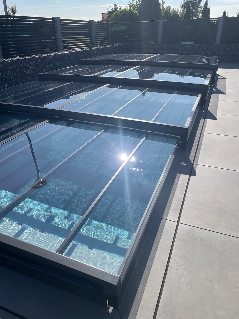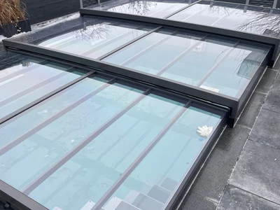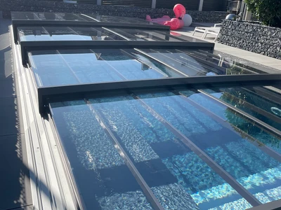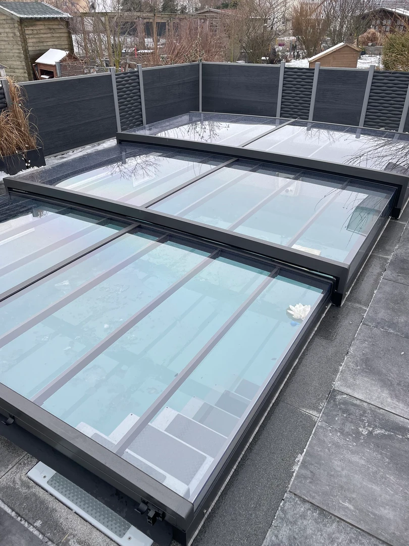 A szerkezet különlegessége az egyoldalon elhelyezett keskeny vezetősín, amely nemcsak az elemek könnyed mozgatását biztosítja, hanem zavartalan hozzáférést is nyújt a többi oldal felől. Ez a megoldás praktikus és felhasználóbarát, különösen a mindennapi használat során. A teljes zárrendszernek köszönhetően a fedés megbízható védelmet nyújt a kedvezőtlen időjárással szemben, emellett fokozott biztonságot jelent gyermekek és háziállatok számára is.