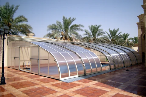 A diszkréten ívelt profil letisztult formavilágot biztosít, amely tökéletesen illeszkedik a meglévő falhoz, és kompakt, elegáns egységet alkot vele. A felső sín a függőleges falra kerül, ezzel hatékonyan védi a medencét, valamint a fal és a medence közötti területet a kedvezőtlen időjárástól.