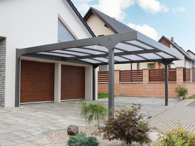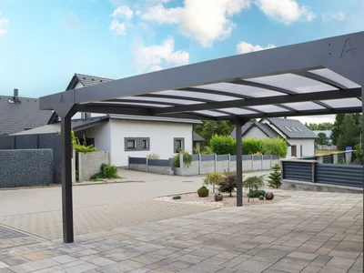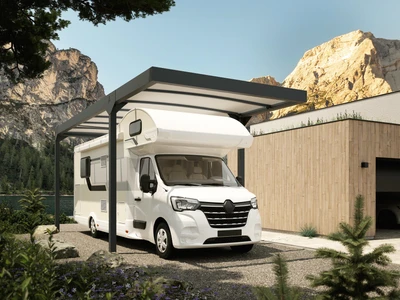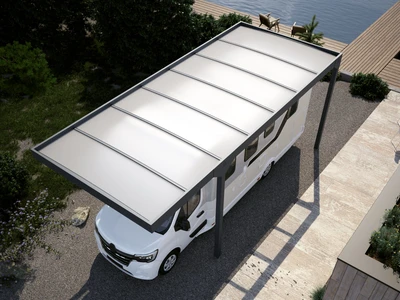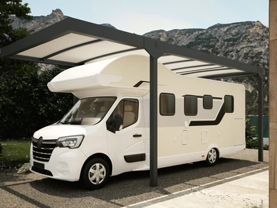 A CARPORT CAMPER erős alumínium szerkezetű, polikarbonát tetős fedés lakóautóknak. Három méretben (Standard, L, XL) elérhető, szabadon álló vagy épülethez rögzíthető, véd az esőtől, hótól és napsütéstől.