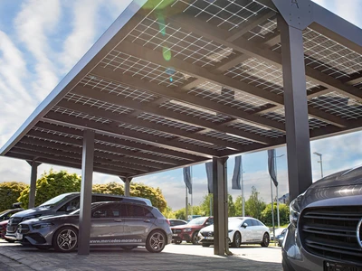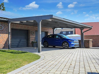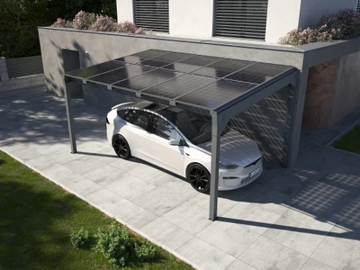 A Carport Solar Solid rugalmasan méretezhető, keretes napelemekkel kompatibilis, antracit színű napelemes autóbeálló. Hatékony, helytakarékos és költséghatékony megoldás járművek vagy flották védelmére, a hagyományos garázsok helyett.