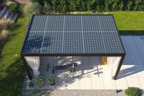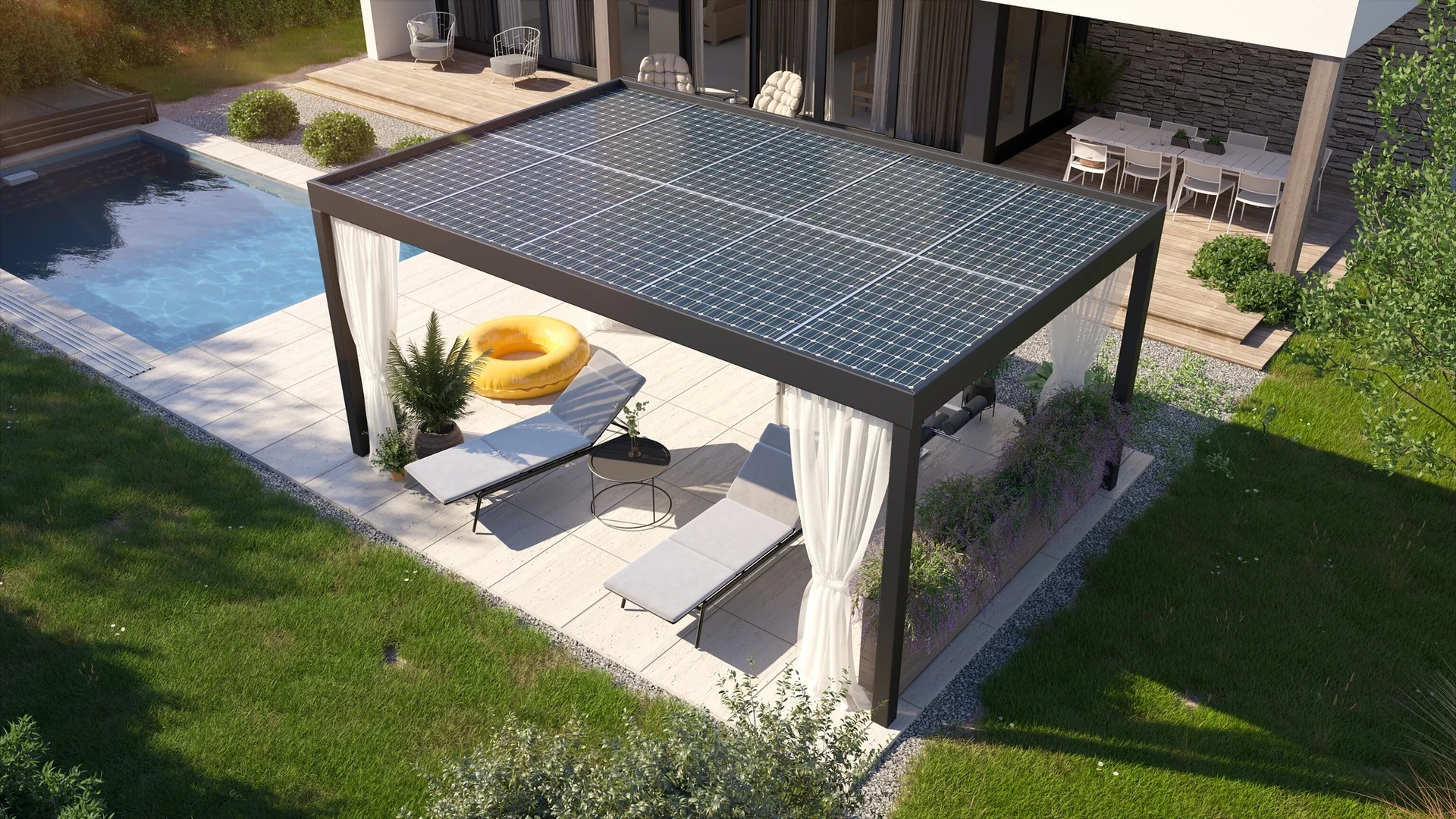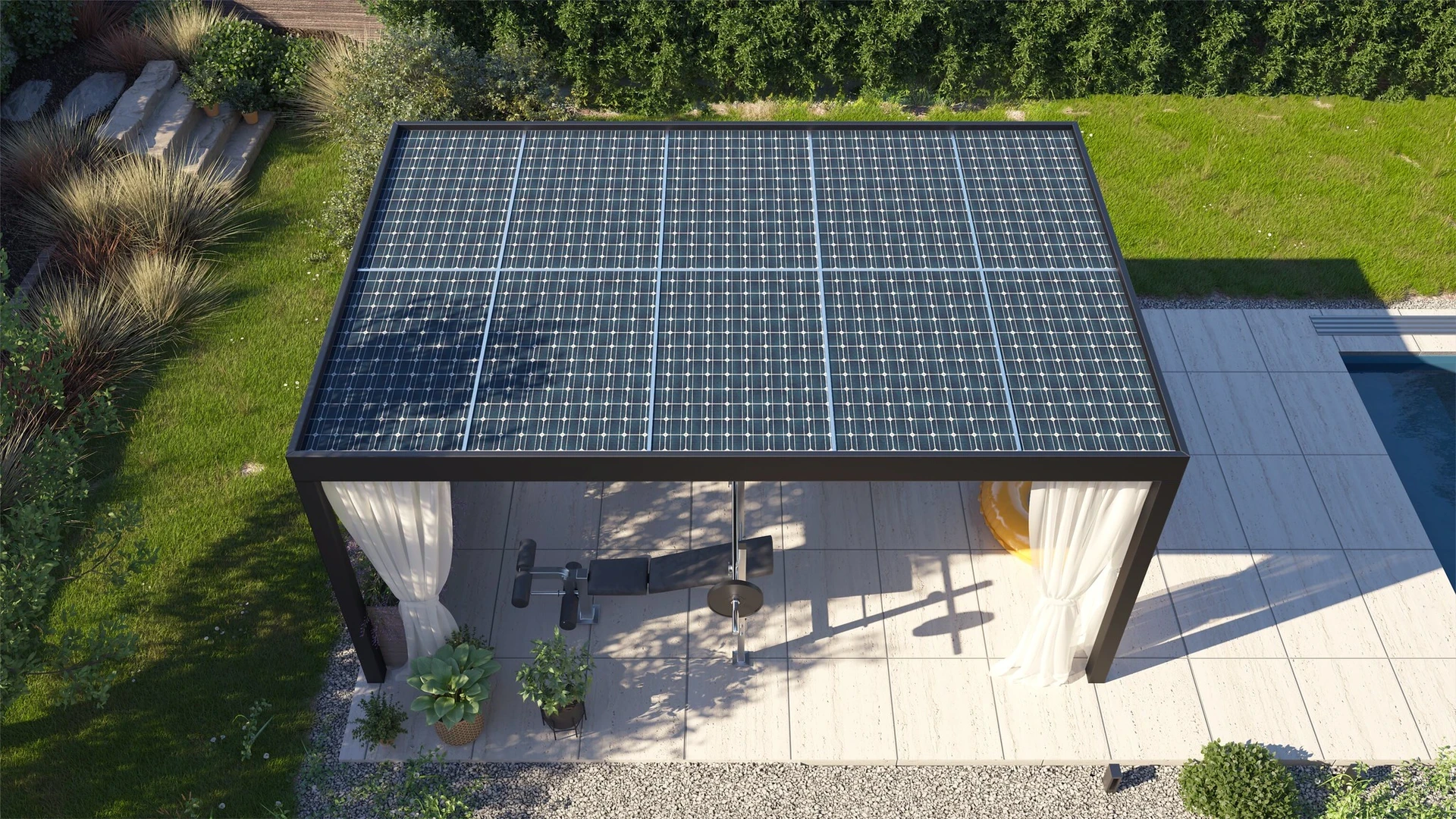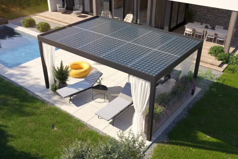 A PERGOLA SOLAR a stílusos formatervezés és a környezettudatos technológia tökéletes harmóniája. Ez a napelemes tetővel felszerelt elegáns pergola lehetővé teszi, hogy a napenergiát közvetlenül hasznosítsa medencetechnológiája működtetésére, csökkentve az elektromos hálózattól való függőséget, miközben aktívan támogatja a fenntartható életmódot.